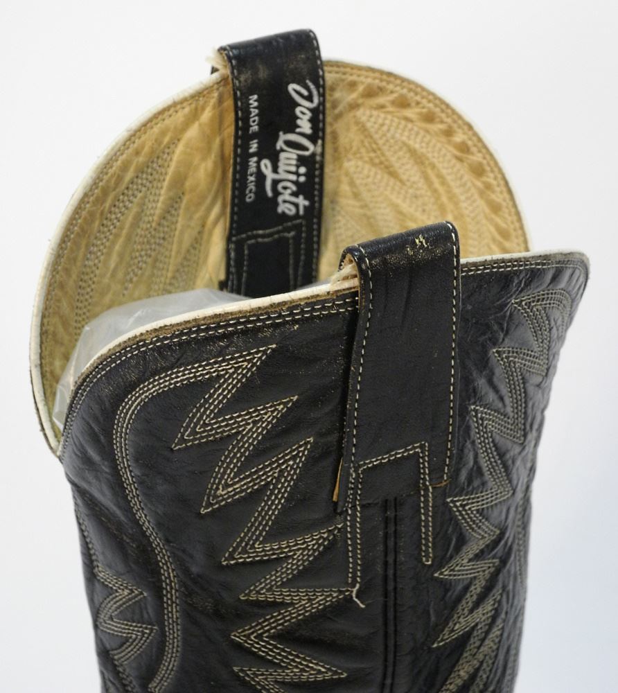LOT 12 Pair of Don Quixote Black Leather Cowboy Boots, size 9 1/2". Estimate: $50 - $100 Auction Date: Tuesday, July 11 2023 at 4:00 PM