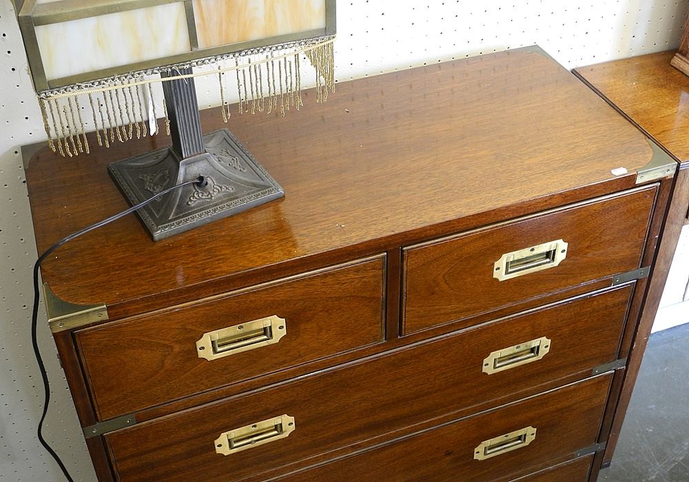 LOT 31 Reproduction Mahogany Campaign Style Chest, 33 1/4" x 32" x 14 1/2" (chipped edges noted). Estimate: $80 - $100 Auction Date: Tuesday, July 11 2023 at 4:00 PM