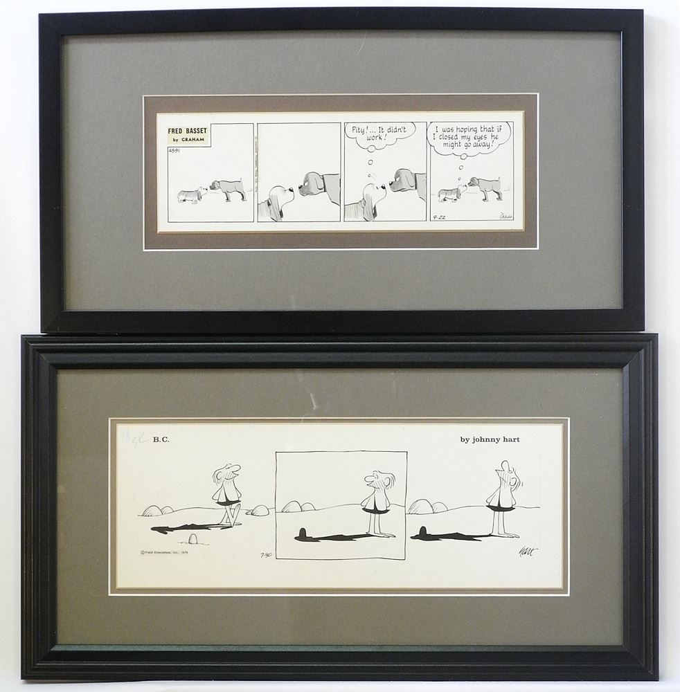 LOT 224 2 Original Cartoon Strips B.C. (Johnny Hart) and Fred Bassett (Graham), 5 5/8 x 15 5/8". Estimate: $60 - $100 Auction Date: Tuesday, July 11 2023 at 4:00 PM