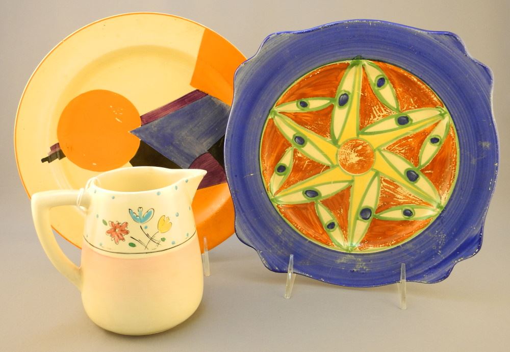 LOT 221 2 Pieces of Clarice Cliff and a Gray Pottery Plate. Estimate: $100 - $150 Auction Date: Tuesday, July 11 2023 at 4:00 PM