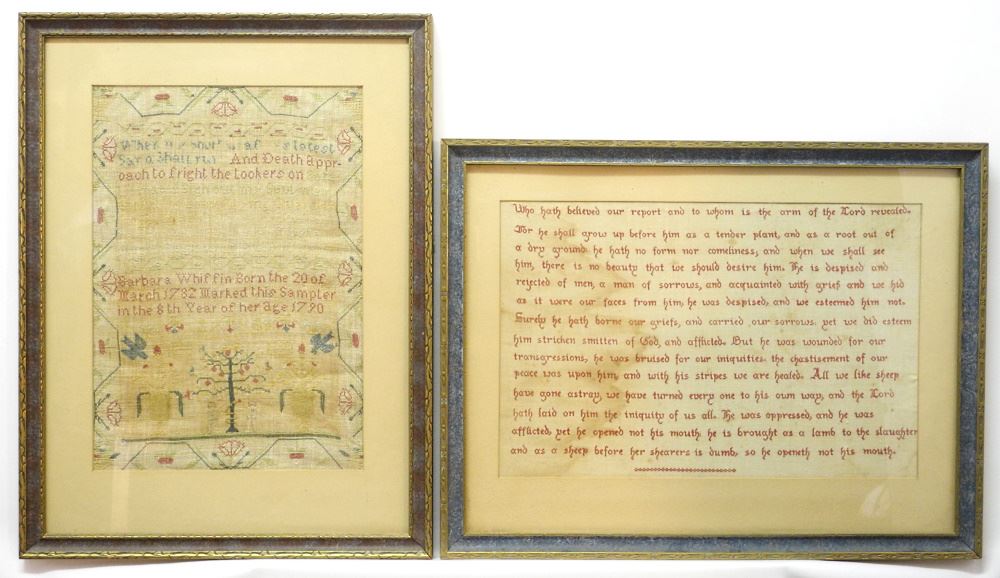 LOT 101 Two Antique Samplers: Barbara Whiffin 1790 & Biblical Quote 15 1/4" X 10 1/2". Estimate: $80 - $100 Auction Date: Tuesday, July 11 2023 at 4:00 PM