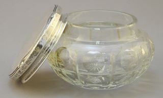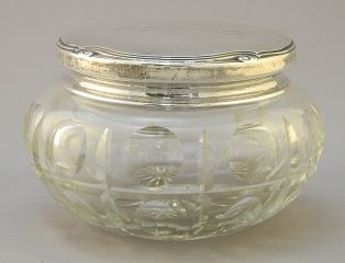 LOT 132 Crystal Dresser jar Monogrammed with Sterling(mashed) Silver Cover, 2 3/4" x 4 3/8" diam. Estimate: $50 - $60 Auction Date: Tuesday, July 11 2023 at 4:00 PM