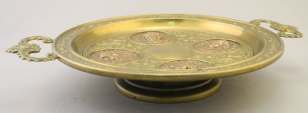 19th Century Brass Tazza inset of Copper Portrait Rondels, 2 3/8 x 14 x 10 1/4".
