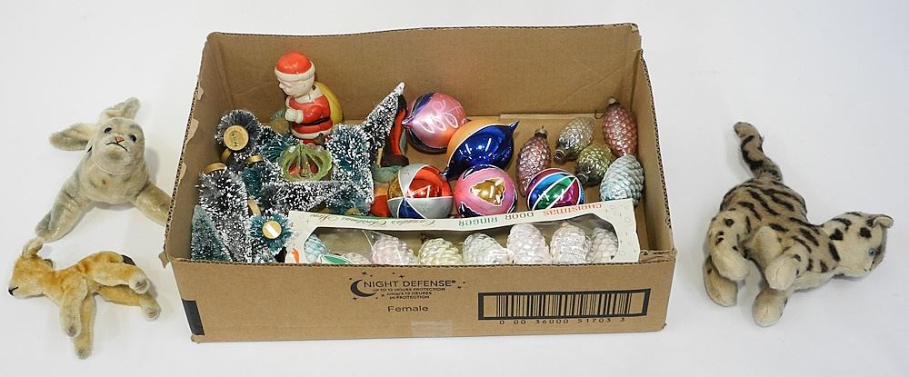 Collection of Vintage Christmas Ornaments and 3 Steiff Style Animals