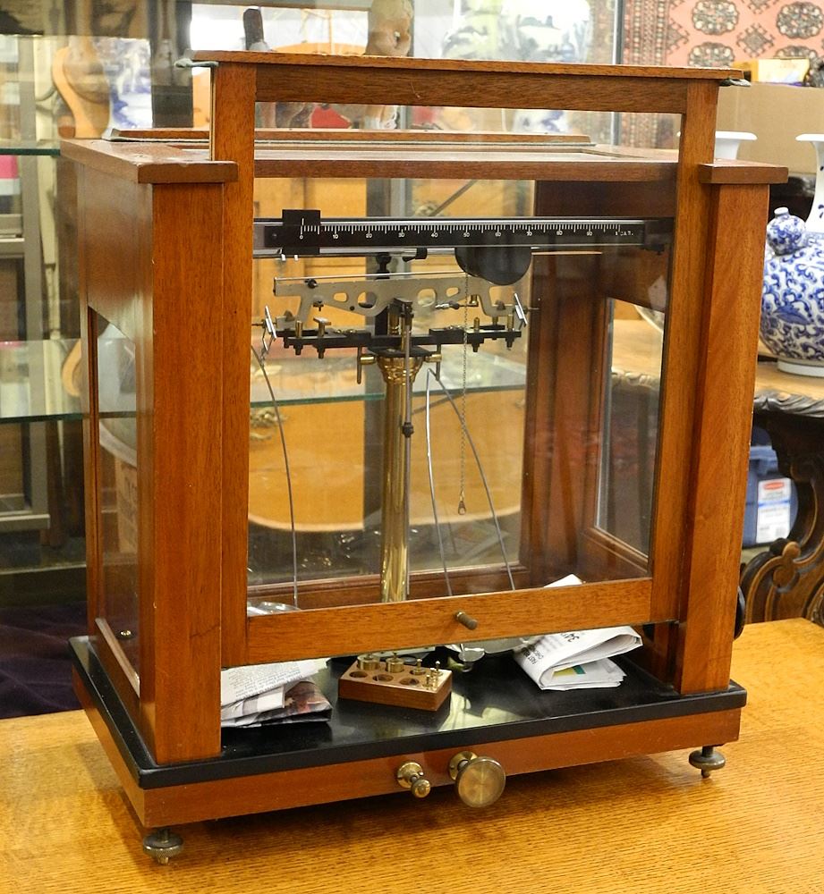 LOT 173 Mahogany Cased Scientific Scales, 17 1/4" x 17 1/2". Estimate: $120 - $180 Sold For: $80 Auction Date: Tuesday, September 12 2023 at 4:00 PM