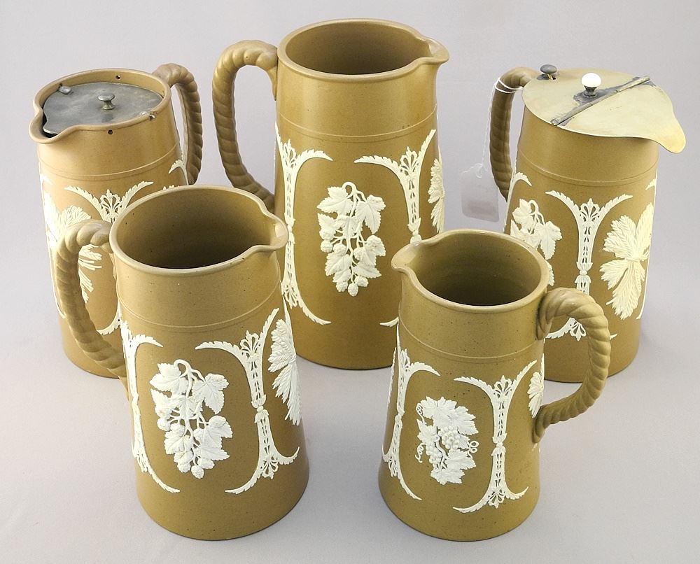 LOT 257 Graduated set of 5 Dudson Jasperware Pitchers with Fruit Design, 2 with lids, Tallest 8". Estimate: $80 - $120 Sold For: $25 Auction Date: Tuesday, September 12 2023 at 4:00 PM