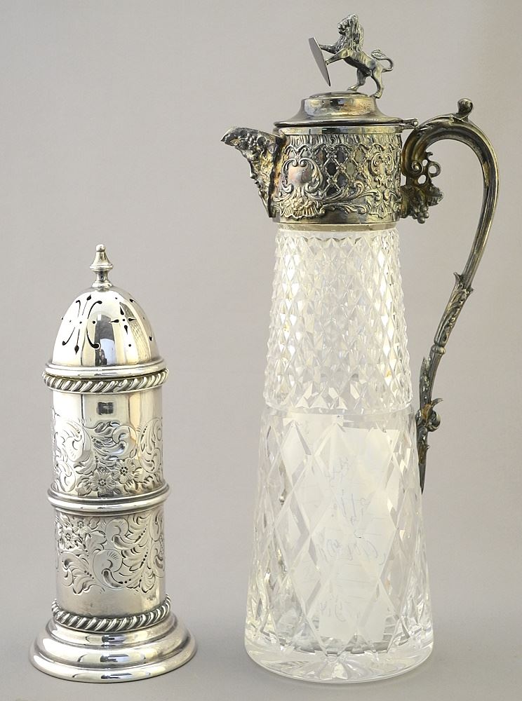 LOT 244 Cut Glass and Silver Plate Claret Jug (12 1/2"H) with Plated Sugar Shaker & Cutlery. Estimate: $80 - $100 Sold For: $40 Auction Date: Tuesday, September 12 2023 at 4:00 PM