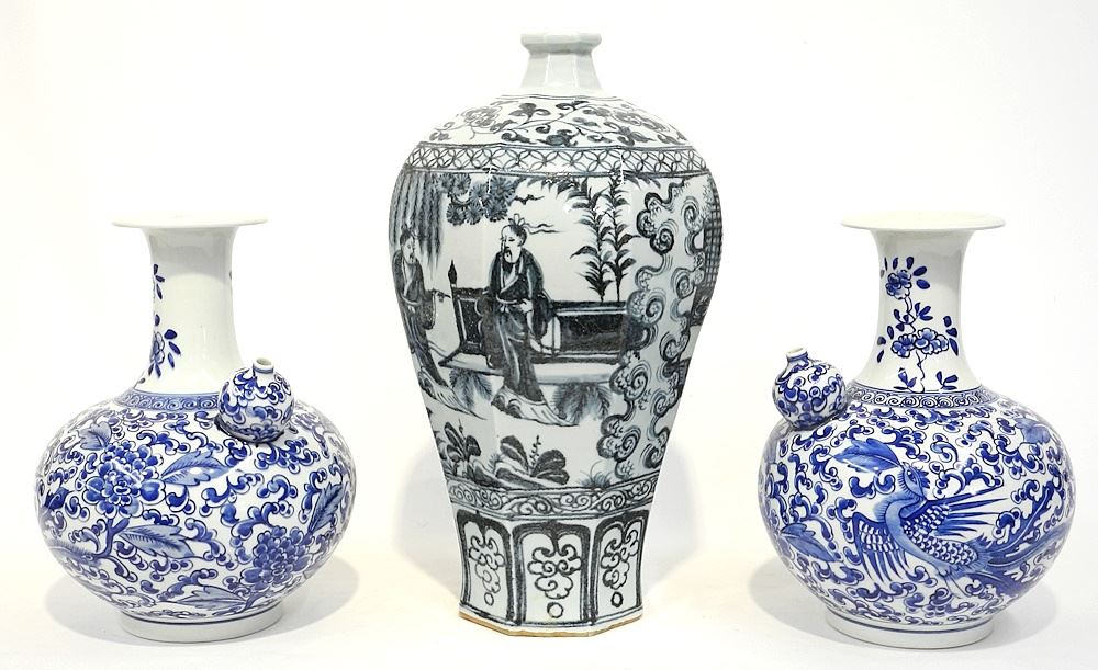 3 Blue and White Chinese Porcelain Vases, 14 1/2".