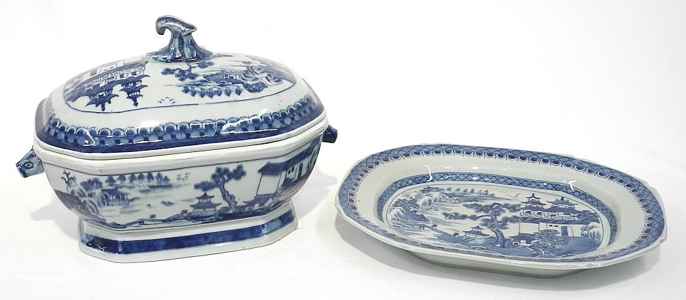 Blue and White Chinese Porcelain Container with Plate, 11".