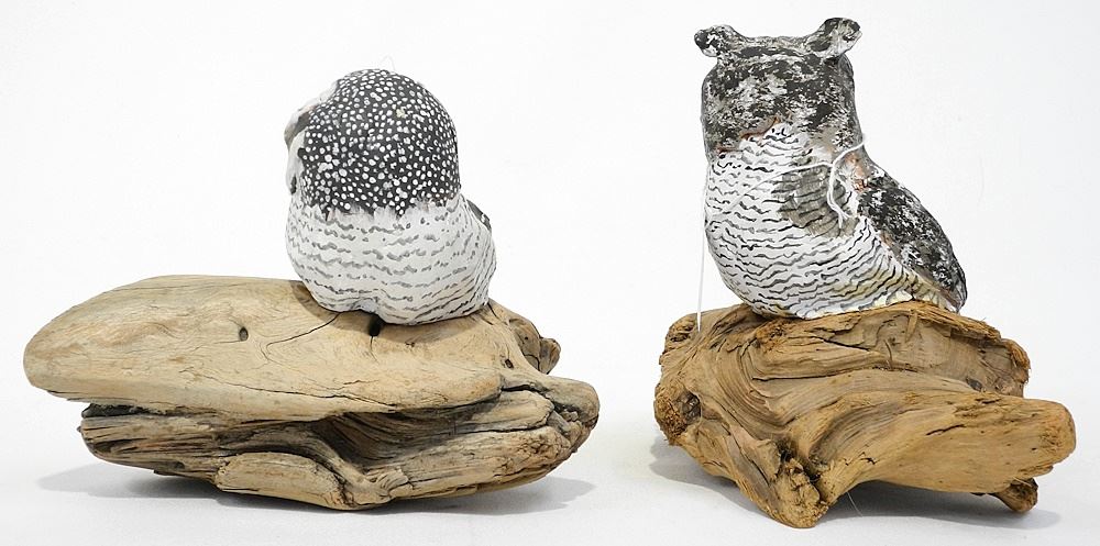 2 Pottery Owl Dioramas Monogrammed EL (Edith Lansdowne), 7 & 6 1/4"H (chip noted).