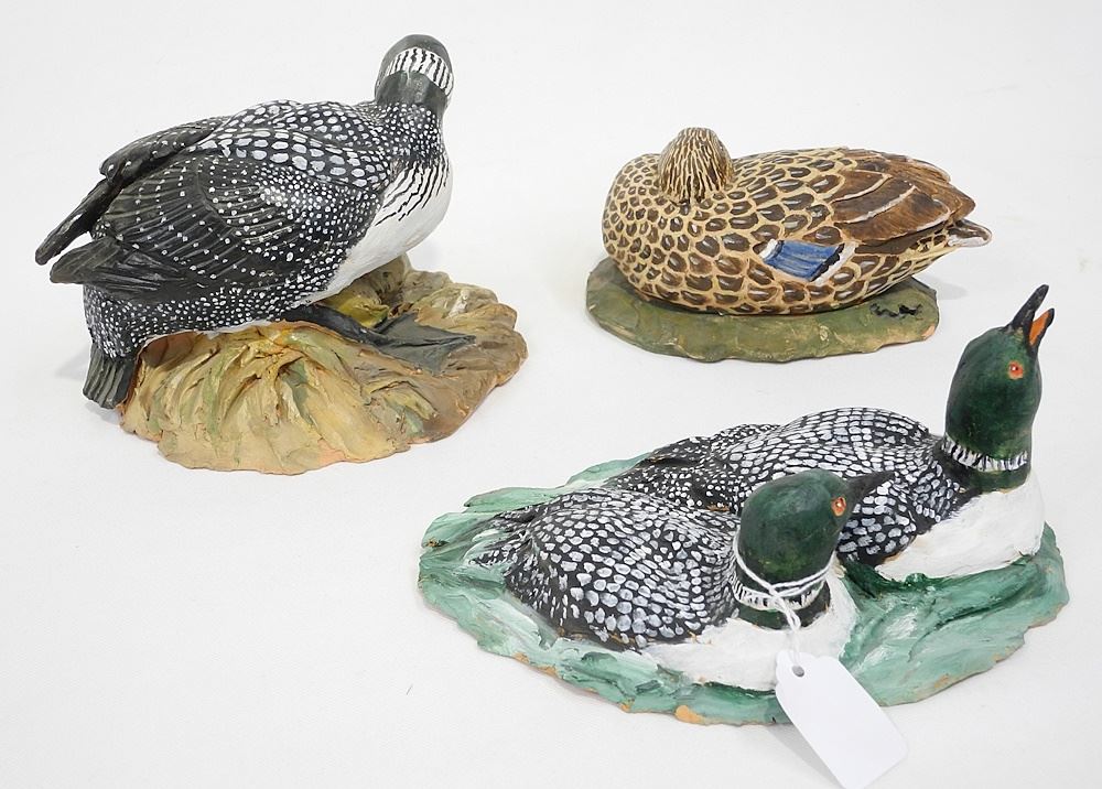 3 Pottery Duck & Loon Diorama Monogrammed EL (Edith Lansdowne), Largest 8 1/4"W (chips).