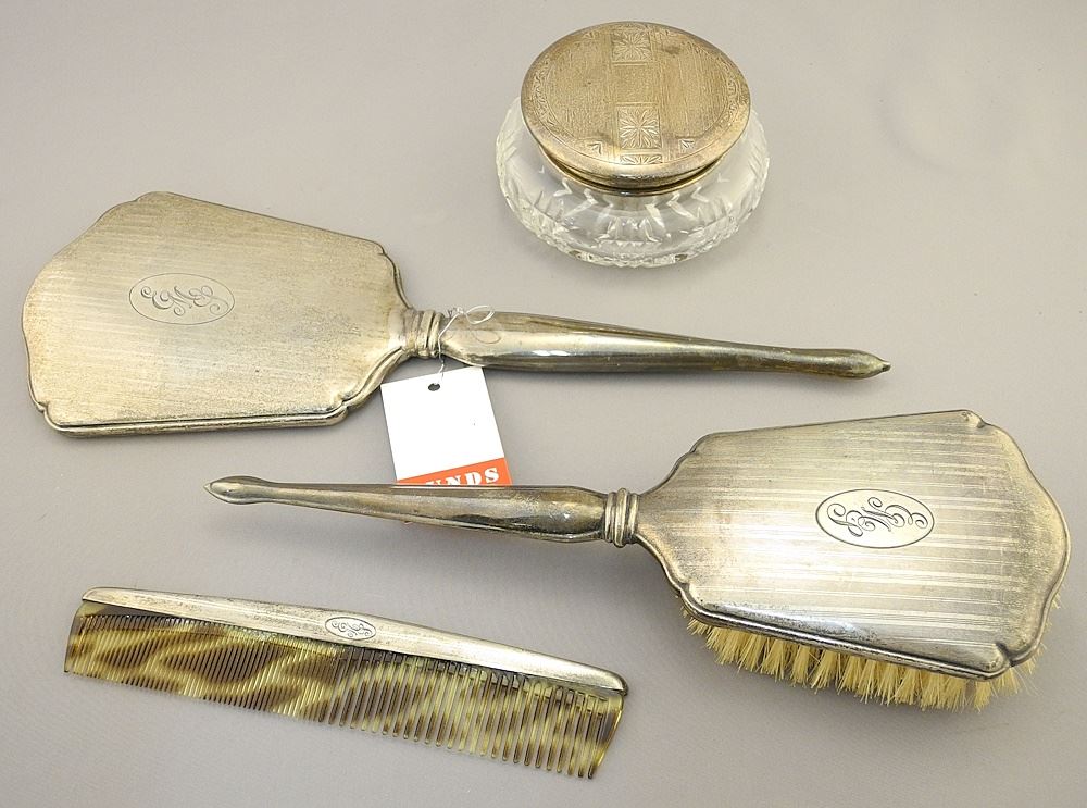 2 Partial Sterling Silver Dresser Sets, and Dresser Jar (7 pcs), Mirror 13 1/4".