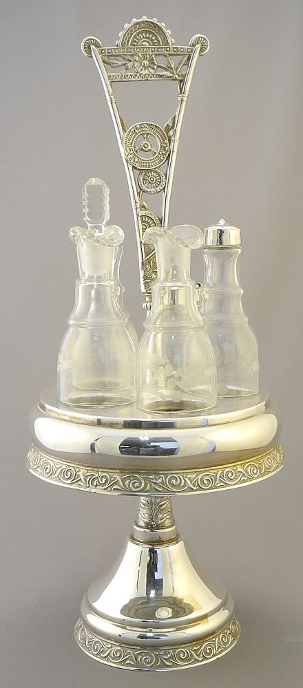 LOT 191 Silver Plated Cruet Stand, 17 1/2"H, (lacking one stopper). Estimate: $50 - $60 Sold For: $30 Auction Date: Tuesday, September 12 2023 at 4:00 PM