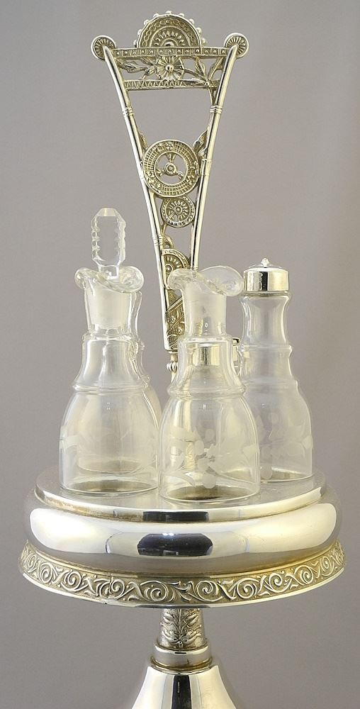 Silver Plated Cruet Stand, 17 1/2"H, (lacking one stopper).