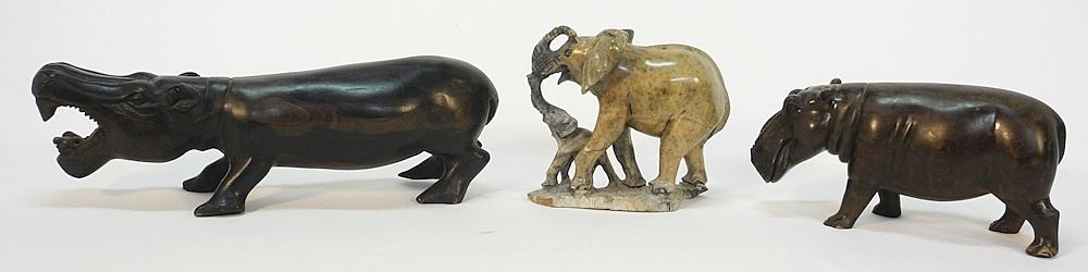 Collection of Various African Animal Figurines: Hippos / Turtle / Monkey / Elephants, Longest 13 1/