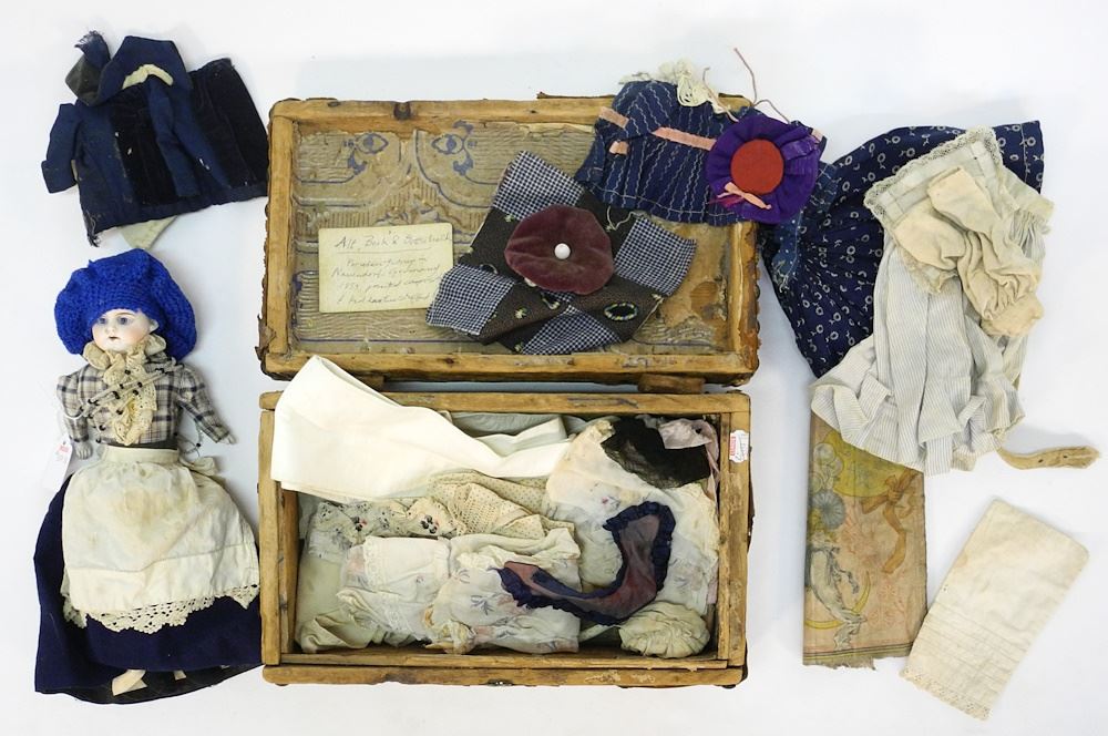 Alt Beck & Gottschalk Porcelain Head Doll (11 3/4") with Trunk & Clothes.
