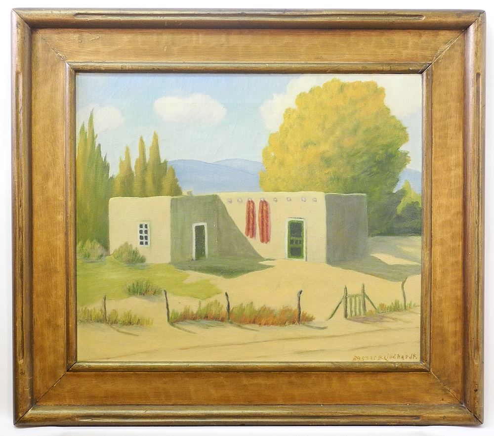 LOT 17 Oil on Canvas signed Dagmar Lindhart, 16 7/8 x 20 1/8", "New Mexico Adobe House". Estimate: $150 - $200 Sold For: $140 Auction Date: Tuesday, November 07 2023 at 4:00 PM