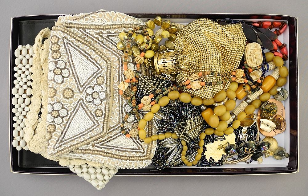 LOT 87 Tray of Various Costume Jewelry, Egyptian Beads & Evening Bags Incl. Whiting & Davis. Estimate: $60 - $100 Sold For: $90 Auction Date: Tuesday, November 07 2023 at 4:00 PM