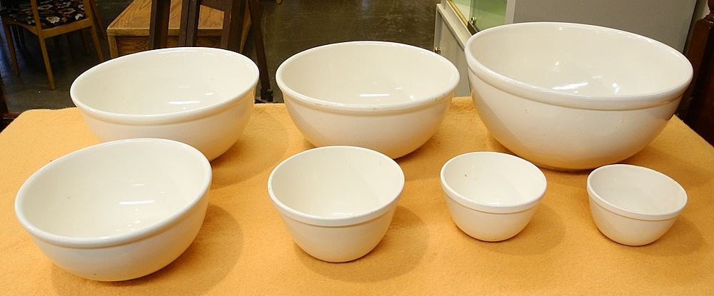 Harlequin Set of Graduated White Pottery Mixing Bowls, 7 Pieces, 2 3/4 - 6 3/4"H.