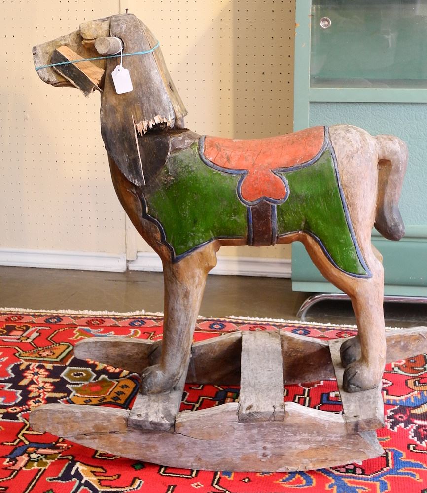 LOT 5 Dog Form Rocking Toy, 29 x 30 1/2 x 15" (as found, condition noted). Estimate: $50 - $100 Sold For: $90 Auction Date: Tuesday, November 07 2023 at 4:00 PM
