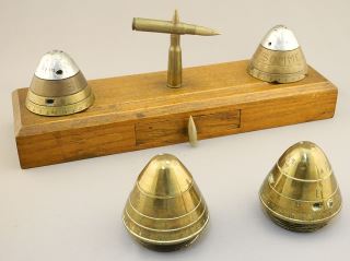 LOT 267 "Somme" Trench Art Desk Stand Made by Armourer J. Bartlett 154487, 11 3/4"W with 4 Nose Fuses Estimate: $100 - $150 Sold For: $90 Auction Date: Tuesday, January 23 2024 at 4:00 PM