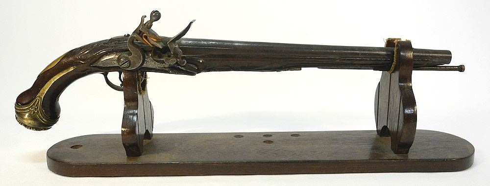 18th Century Flintlock Pistol (21 1/4"L) with Horn Container & Powder Measures, signed Indistinc