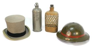 LOT 87 Collection of Militaria: Fire Service Helmet / Spurs / Belt / Holster / Top Hat. Estimate: $80 - $120 Sold For: $300 Auction Date: Tuesday, January 23 2024 at 4:00 PM
