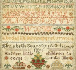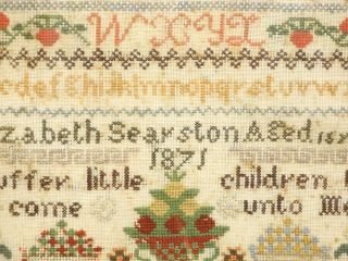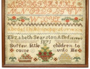 LOT 18 Needlepoint Sampler: Elizabeth Searston Aged 15 Years 1871, 11 3/4" x 12". Estimate: $100 - $150 Sold For: $70 Auction Date: Tuesday, January 23 2024 at 4:00 PM