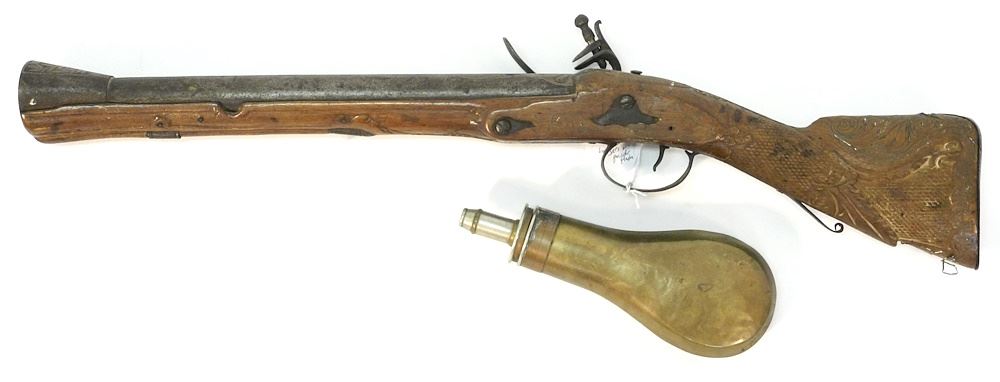 Flintlock Pistol (23 1/8"L) with Powder Flask & Hangers.