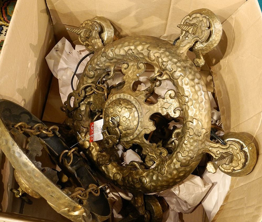 2 Vintage Gilt Cast Metal Light Fixtures, 14" & 18" Diameter.
