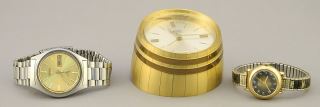 3 Seiko & Bulova Wrist Watches with Swiza Calendar Desk Clock, TH 25 1/2".
