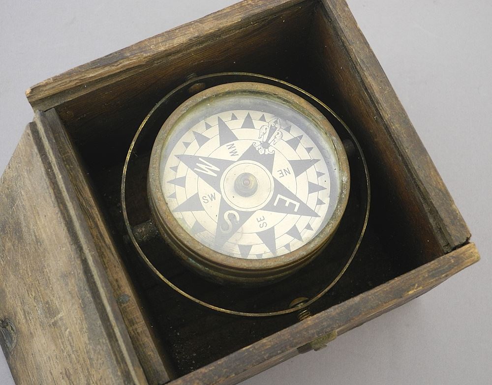 LOT 80 Old Gimballed Compass in Jointed Oak Case, 4 1/8" x 5" x 5". Estimate: $50 - $60 Sold For: $50 Auction Date: Tuesday, May 14 2024 at 4:00 PM