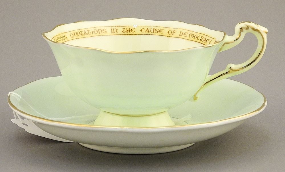 LOT 279 Paragon "Patriotic Series" Churchill Quote Teacup & Saucer. Estimate: $50 - $60 Sold For: $35 Auction Date: Tuesday, May 14 2024 at 4:00 PM