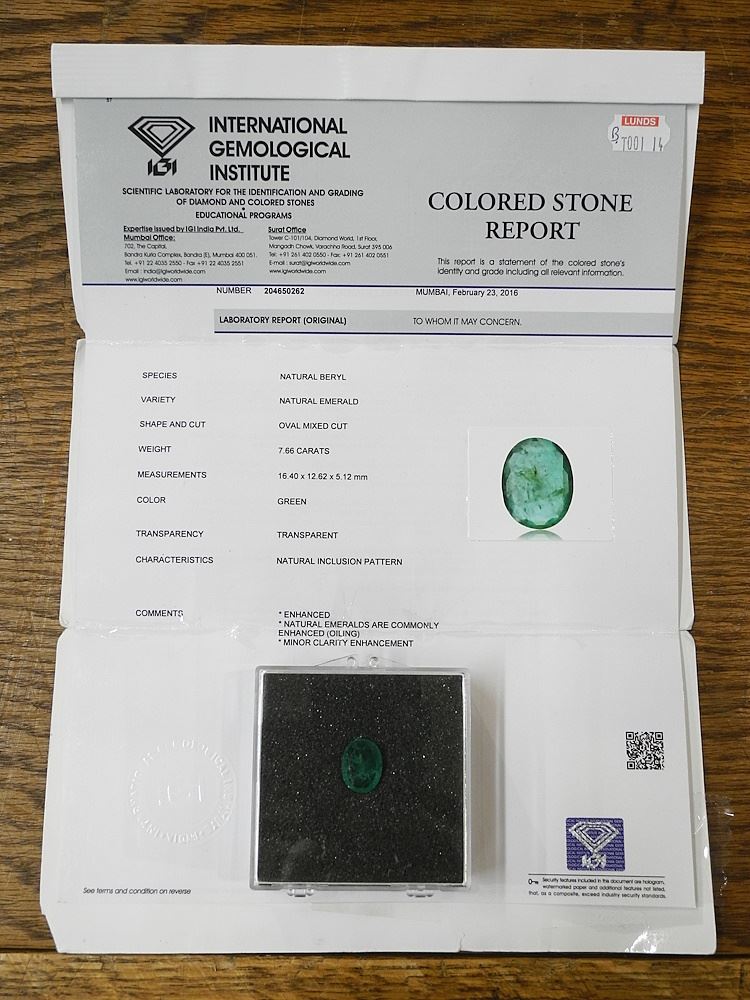 LOT 287 7.66 Carat Natural Emerald with Certificate. Estimate: $800 - $900 Auction Date: Tuesday, May 14 2024 at 4:00 PM
