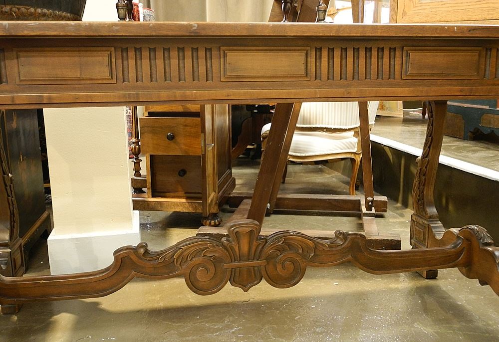 Carved Walnut Trestle Table, 72"L (finish noted).