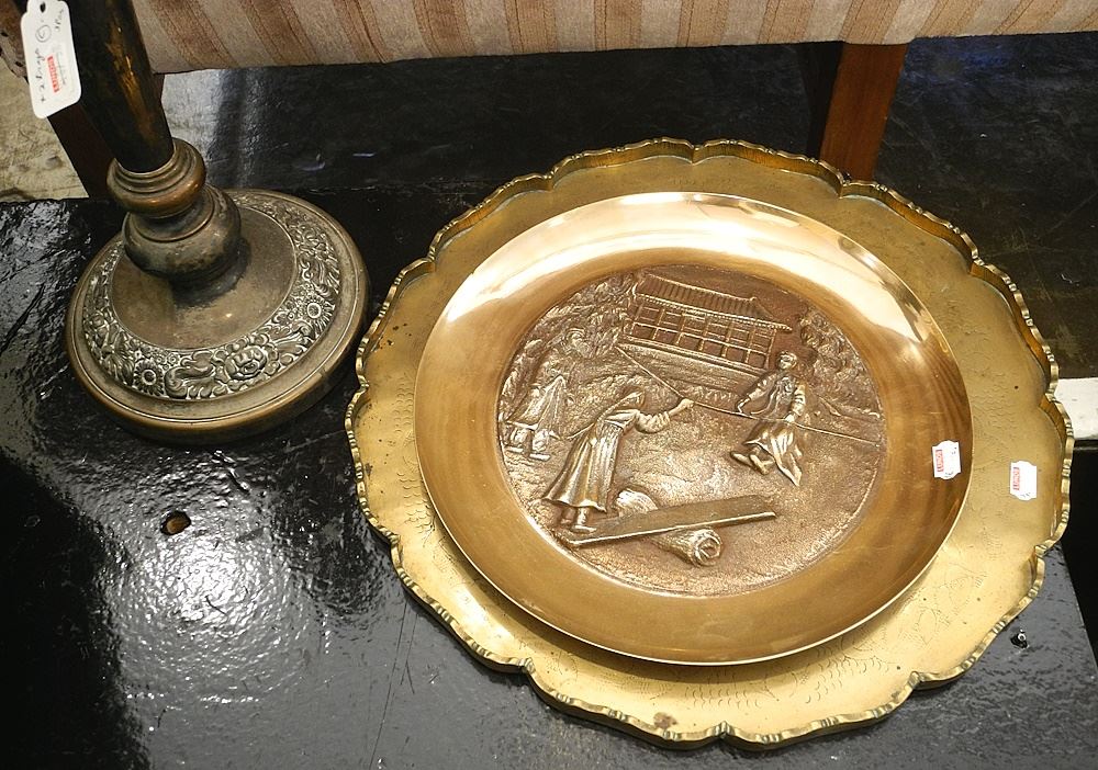 LOT 107 Chinese Bronze Relief Wall Plate, 10 1/2" D., Chinese Brass 14" Tray & 16" Silver Plated Candlest Estimate: $50 - $100 Auction Date: Tuesday, July 09 2024 at 4:00 PM