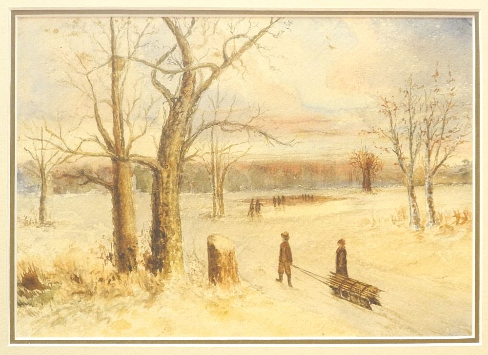 LOT 118 Unsigned Watercolour, 6 1/2" x 9 1/4", "Snow Scene with Stick Gatherers". Estimate: $50 - $60 Sold For: $15 Auction Date: Tuesday, July 09 2024 at 4:00 PM