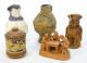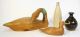 2 Carved Wood Decoys (goose neck noted) & Stoneware Bottles.