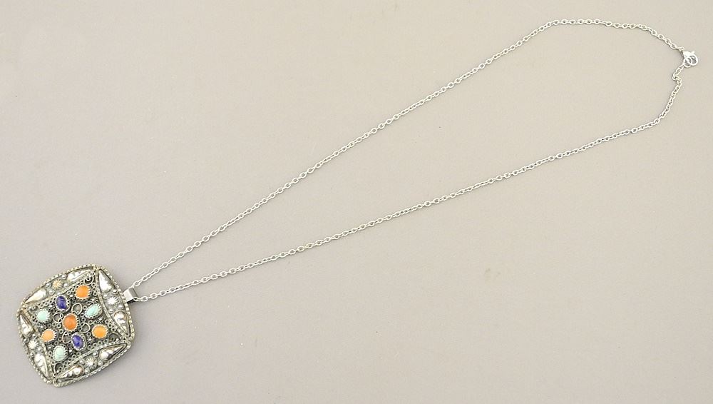LOT 312 Vintage Middle Eastern Jeweled / Silver Pendant Brooch, Carnelian, Lapis, Turquoise. Estimate: $60 - $80 Sold For: $140 Auction Date: Tuesday, July 09 2024 at 4:00 PM