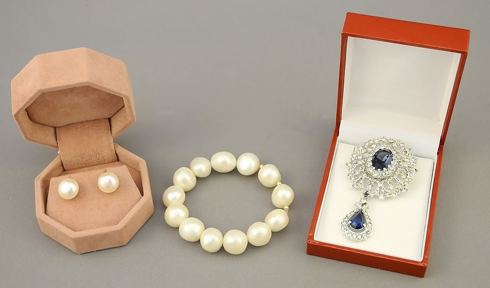 Freshwater Pearl Bracelet & Earrings with Costume Pendant Brooch.