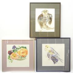 LOT 131 3 Watercolours signed D.G. & Diana Pasmore, 9 3/4" x 9 5/8", "Owls & Flowers". Estimate: $50 - $60 Sold For: $10 Auction Date: Tuesday, July 09 2024 at 4:00 PM