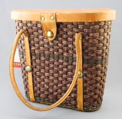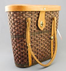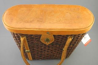 Hand Tooled Mexican 1950's Leather & Rattan Bag / Purse.