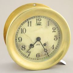 LOT 24 "Chelsea Ships Bell" Brass Nautical Clock, Serial: 569397/57699, with Key (as found). Estimate: $60 - $100 Sold For: $400 Auction Date: Tuesday, September 10 2024 at 4:00 PM