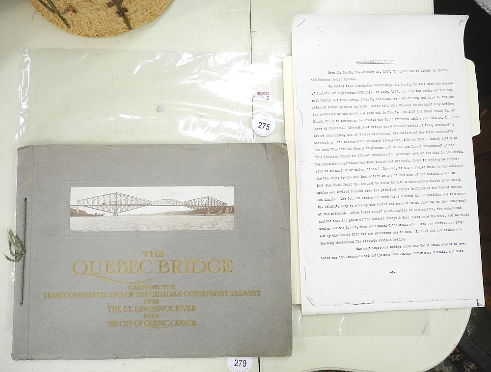 LOT 275 Display Print of "The Quebec Bridge" 17" x 28" with Booklet - from Estate Francis C. McMath. Estimate: $100 - $200 Sold For: $90 Auction Date: Tuesday, September 10 2024 at 4:00 PM