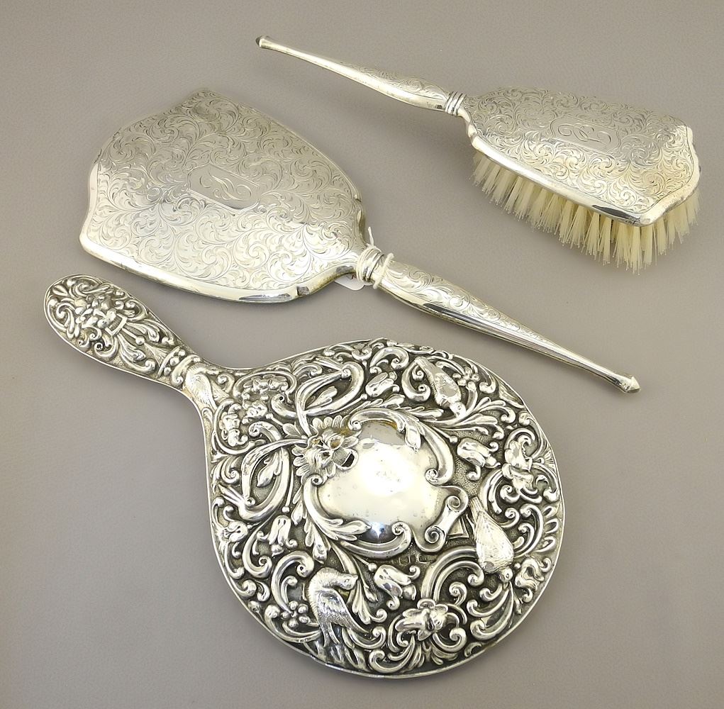 LOT 296 3 Sterling Silver Dressing Items: 2 Mirrors / Brush (as found). Estimate: $100 - $200 Sold For: $160 Auction Date: Tuesday, September 10 2024 at 4:00 PM
