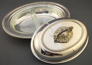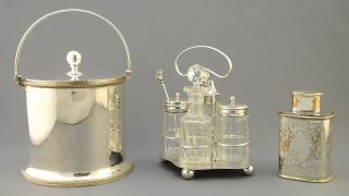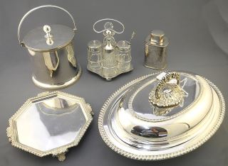 5 Silver Plated Table Wares: Biscuit Barrel (6"h) / Salver / Caddy / Cruet & Entree Dish.