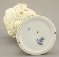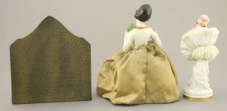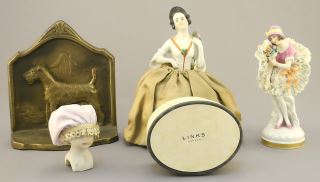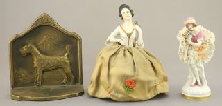 3 Porcelain Figures: Dresden / Pin Cushion / Head & 1 Bronze Bookend.