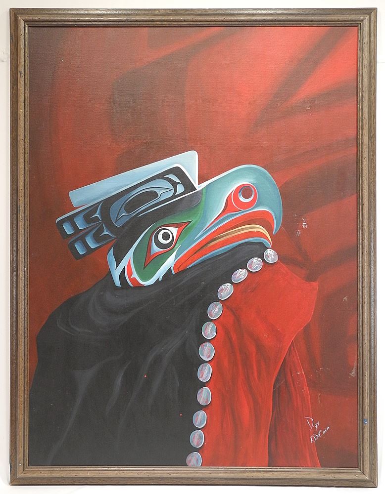 LOT 378 Oil on Canvas signed D. Blain, 40" x 30", "Kwagiulth Mask Composition" (small tear noted). Estimate: $60 - $100 Sold For: $30 Auction Date: Tuesday, January 14 2025 at 4:00 PM