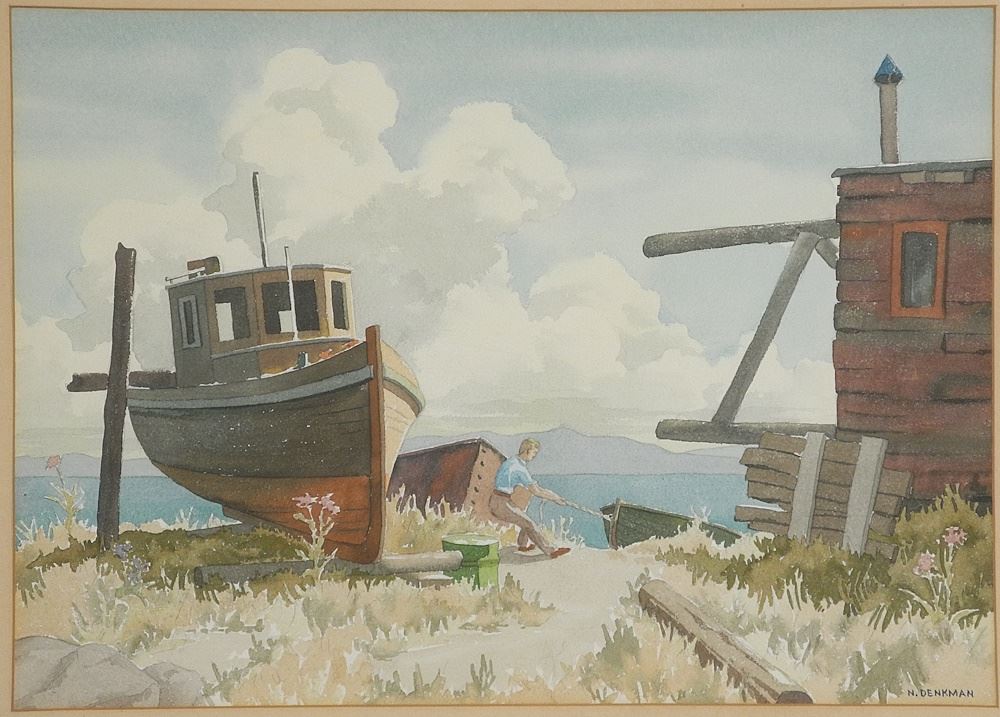 Pair of Watercolour signed N. (Norman) Denkman, 13" x 18 1/4", "Coastal Scene with Old Bo