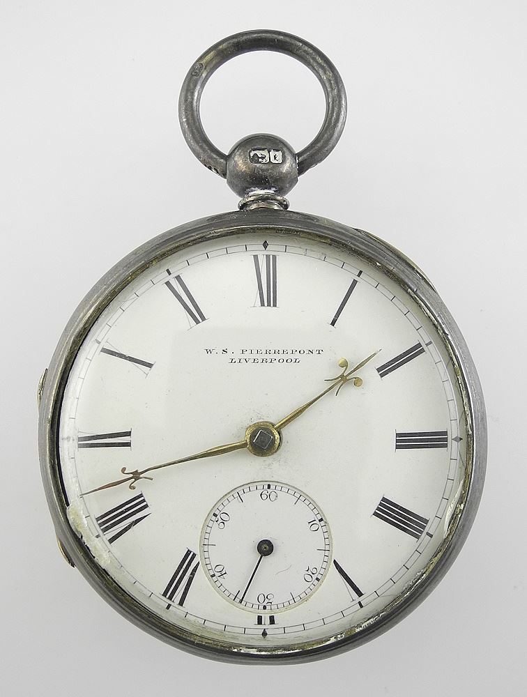 W.S. Pierrepont Liverpool Hallmarked Silver Pocket Watch, 1 7/8" Diam., 100g (as found).